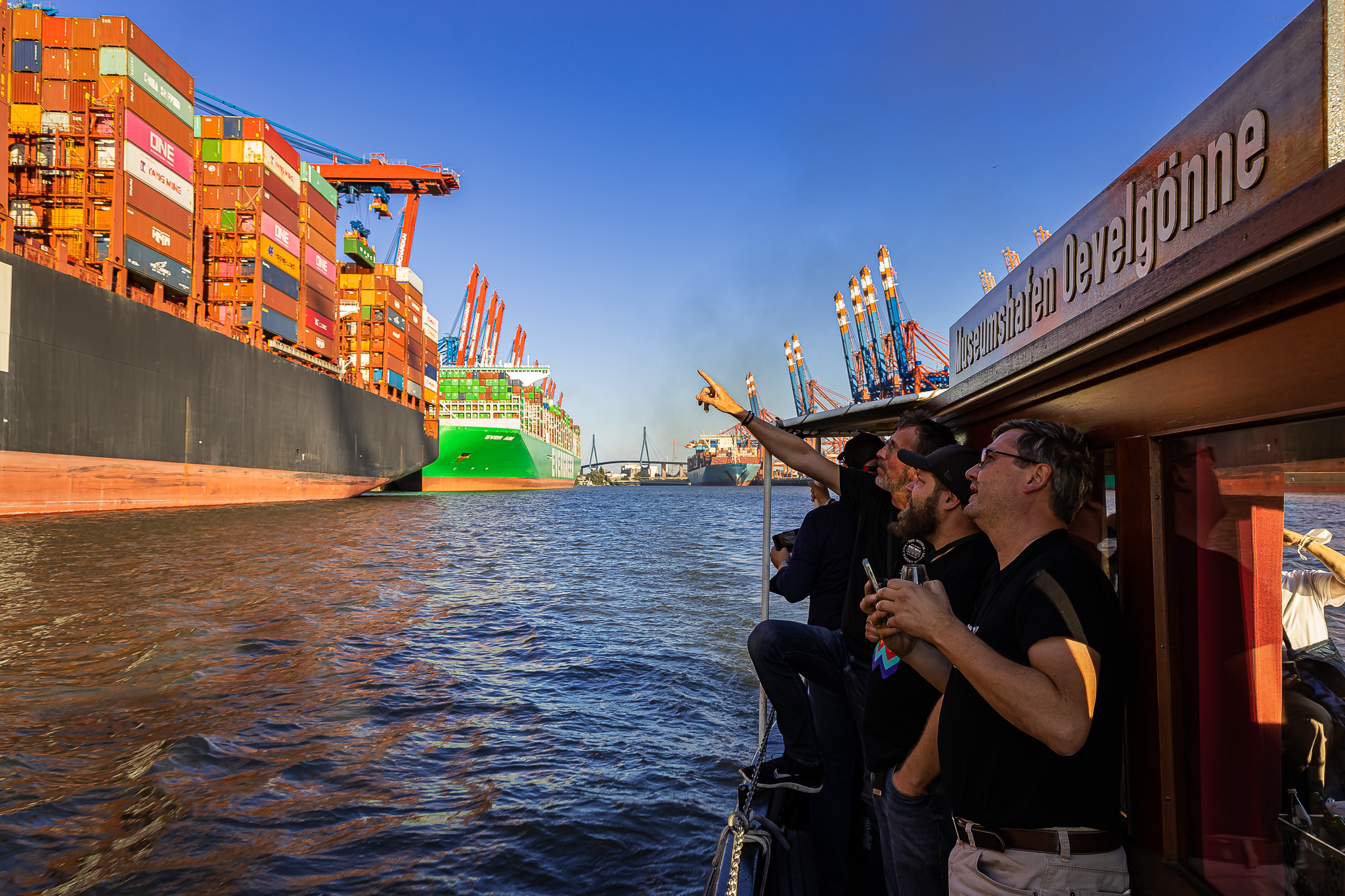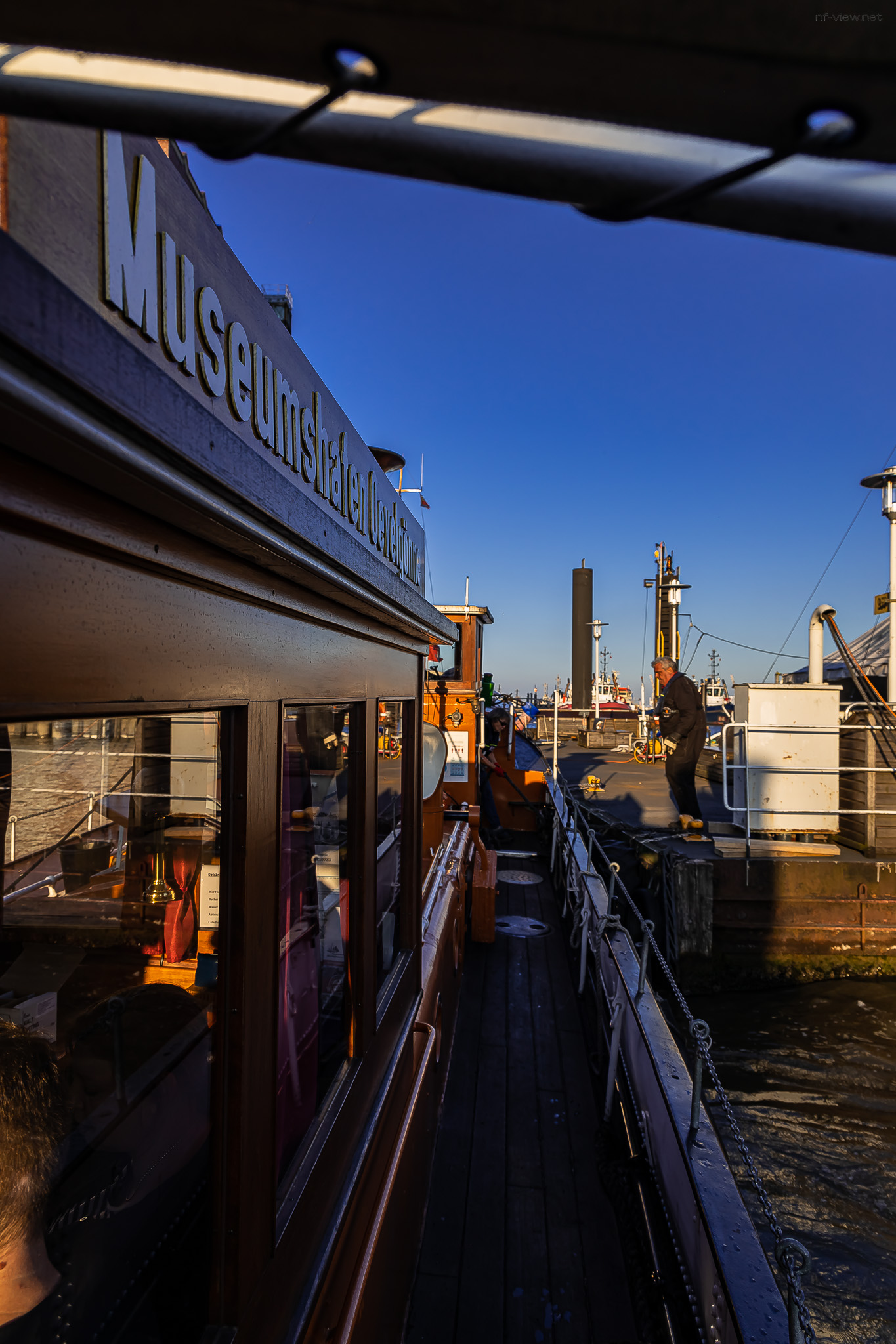 Und so zuckelten wir planmäßig gegen halb sechs vom Oevelgönner Museumshafen los auf unsere kleine Fahrt. Das Wetter war herrlichst. Nicht zu warm, nicht zu kalt, sonnig mit lockerer Bewölkung bei um die 20°C. Besser geht eigentlich nicht.