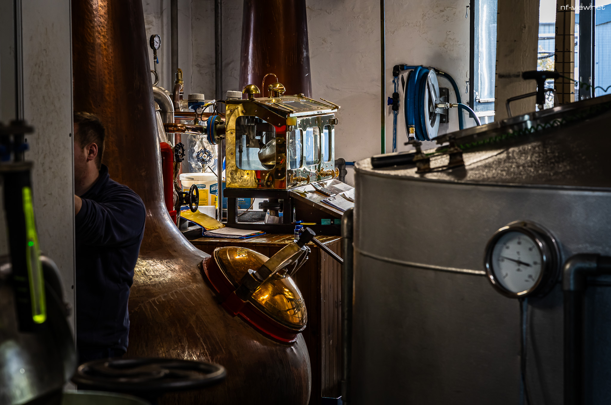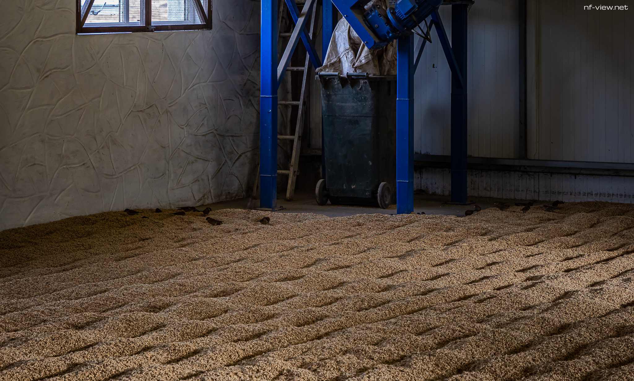 Los ging es mit einer Tour durch die Destillerie. Sehr schönes Detail, auf dem Malzboden „fand“ sich eine Flasche 100% ISLAY, von welchem jeder einen Dram ins Glas bekam und der dann im weiteren Verlauf der Tour verkostet wurde. Der Kilchoman schmeckte da natürlich nochmal so gut. Ein Paradies war der Malzboden dann auch für diverse Kleinvögel, wie man auf einem Foto erkennen kann. Ein weiteres Highlight war dann der New Make Spirit, den wir bei den Brennblasen verkosten durften, Ich habe selten so einen milden und süßen New Make probieren dürfen, trotzdem er 63,5% vol. auf der Uhr hatte. Aber hallo.