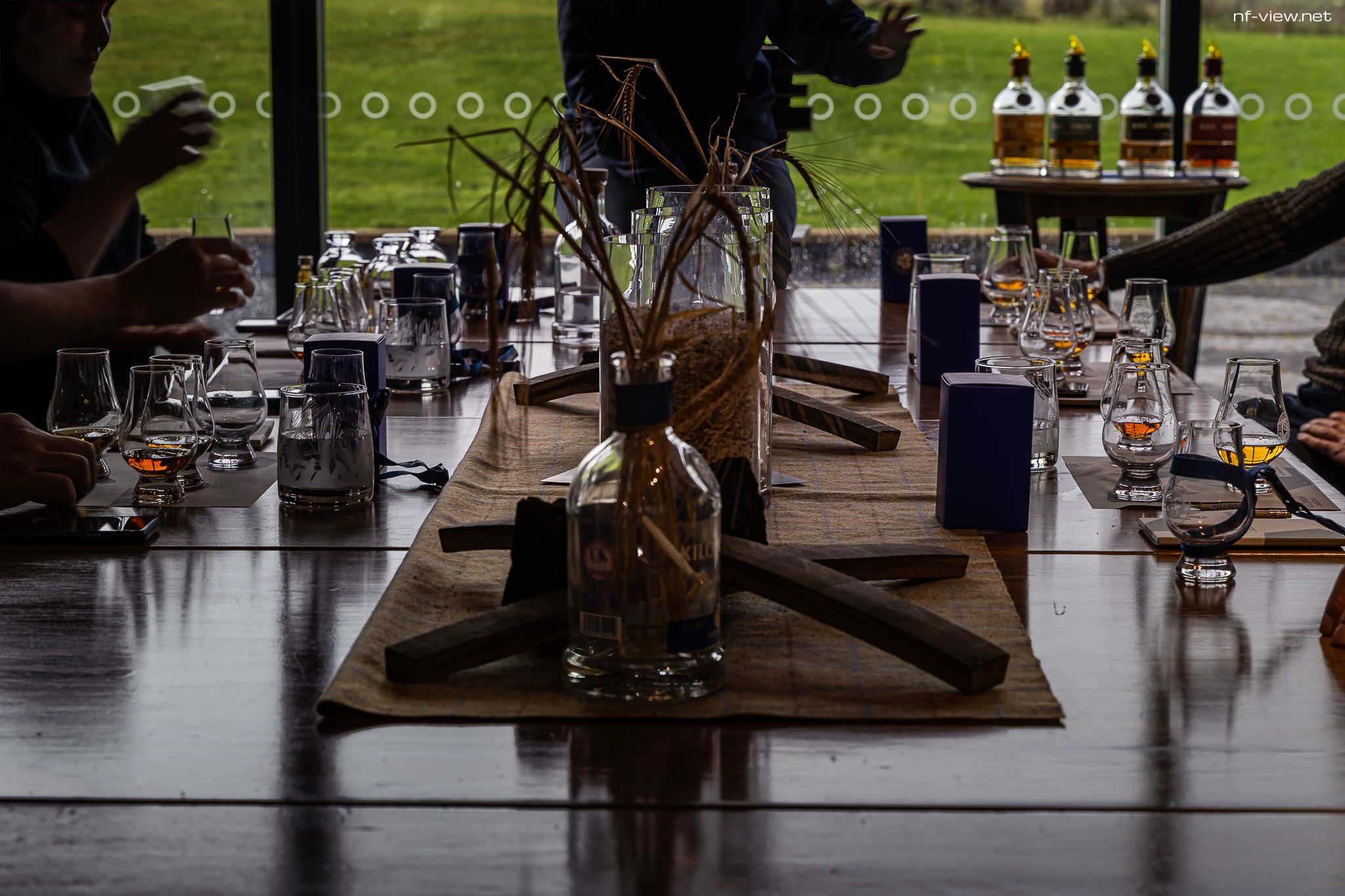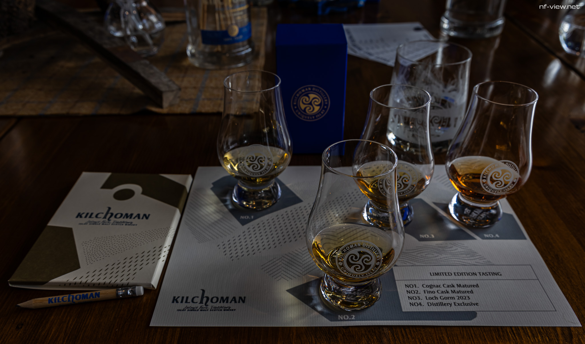 Nach der Tour wurden wir dann in einen der Glaskästen im Besucherzentrum geführt, wo wir dann noch in Ruhe vier verschiedene Abfüllungen aus der Brennerei probieren konnten. Zwar keine Überflieger, aber grundsolide Whiskies der gehobenen Klasse. Hat mir alles in allem sehr gut gefallen bei Kilchoman.
