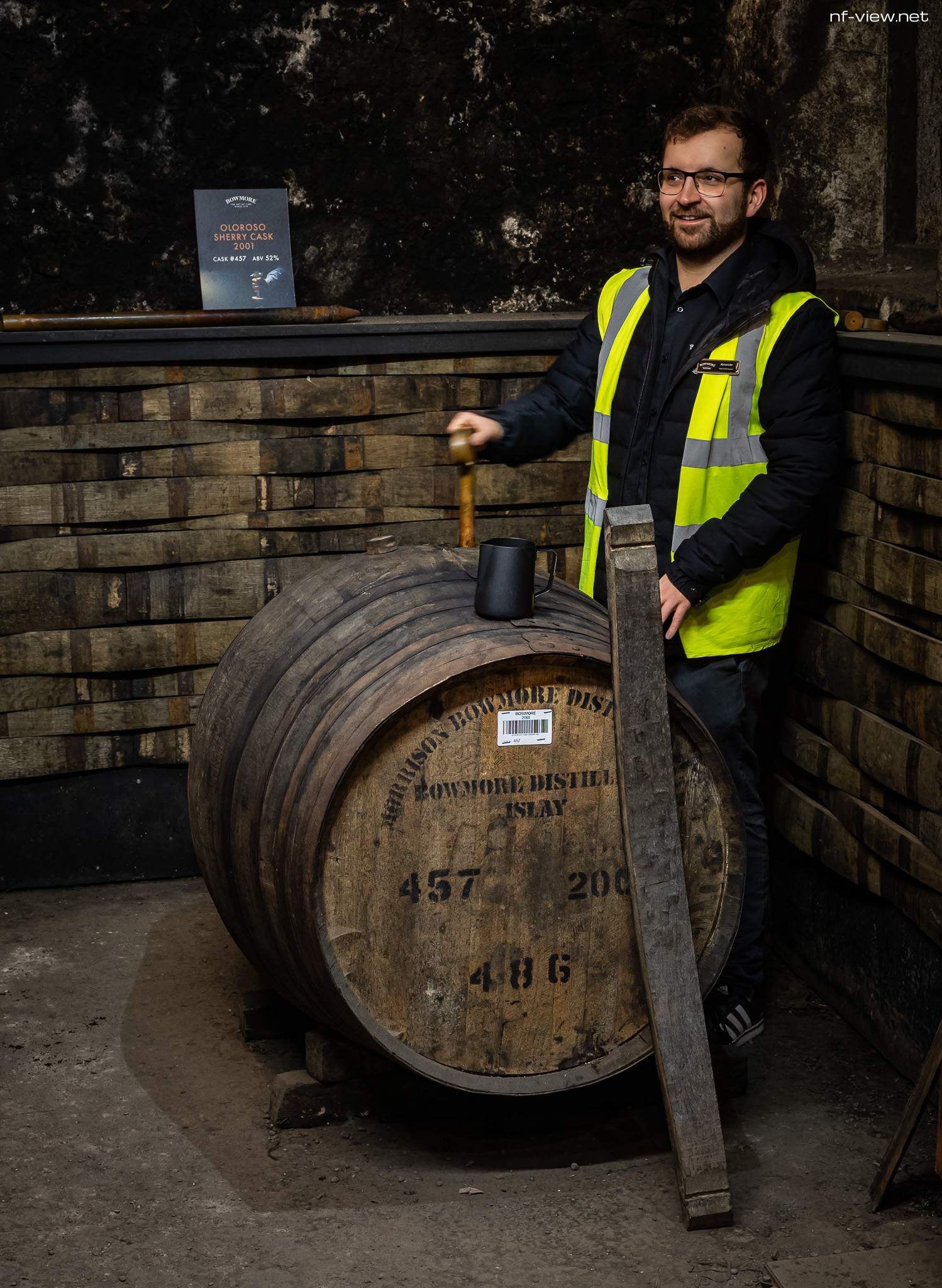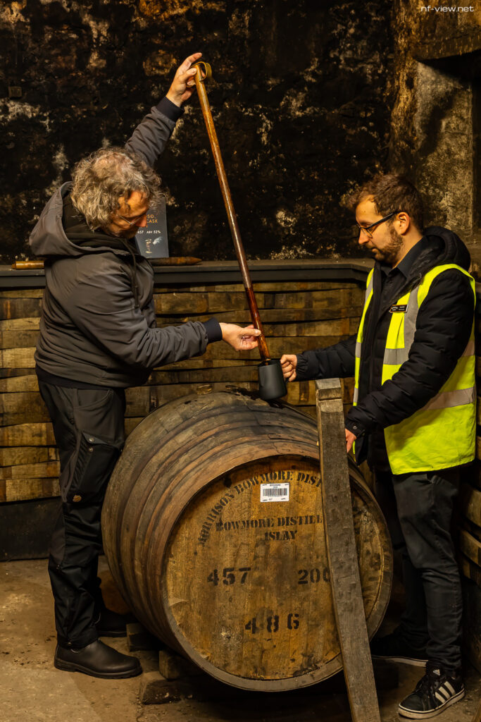 Und die Nummer 3 war dann noch einmal eine Steigerung, hier handelte es sich um einen Whisky, der 23 Jahre in einem Oloroso Sherry Butt mit der Nummer 457 lag. Alleine schon die Farbe, ein herrlicher Anblick. Das Oloroso Fass hat hier ganze Arbeit geleistet, aber ohne das der Bowmore darin absäuft, nein, auch hier gehen Fass und Destillat eine über alles erhabene Symbiose ein. Die Stärke dieses Whiskies von 52% vol. tut sein übriges dazu. Da passte alles. Dieser letzte Whisky war dann auch gleichzeitig mein absoluter Favorit bei diesem Highend Warehouse Tasting und selbstredend füllte ich mir davon auch ein kleines 0,2l-Fläschchen ab. Zudem hatte ich das Vergnügen, diesen phänomenalen Tropfen aus dem Fass holen zu dürfen.
