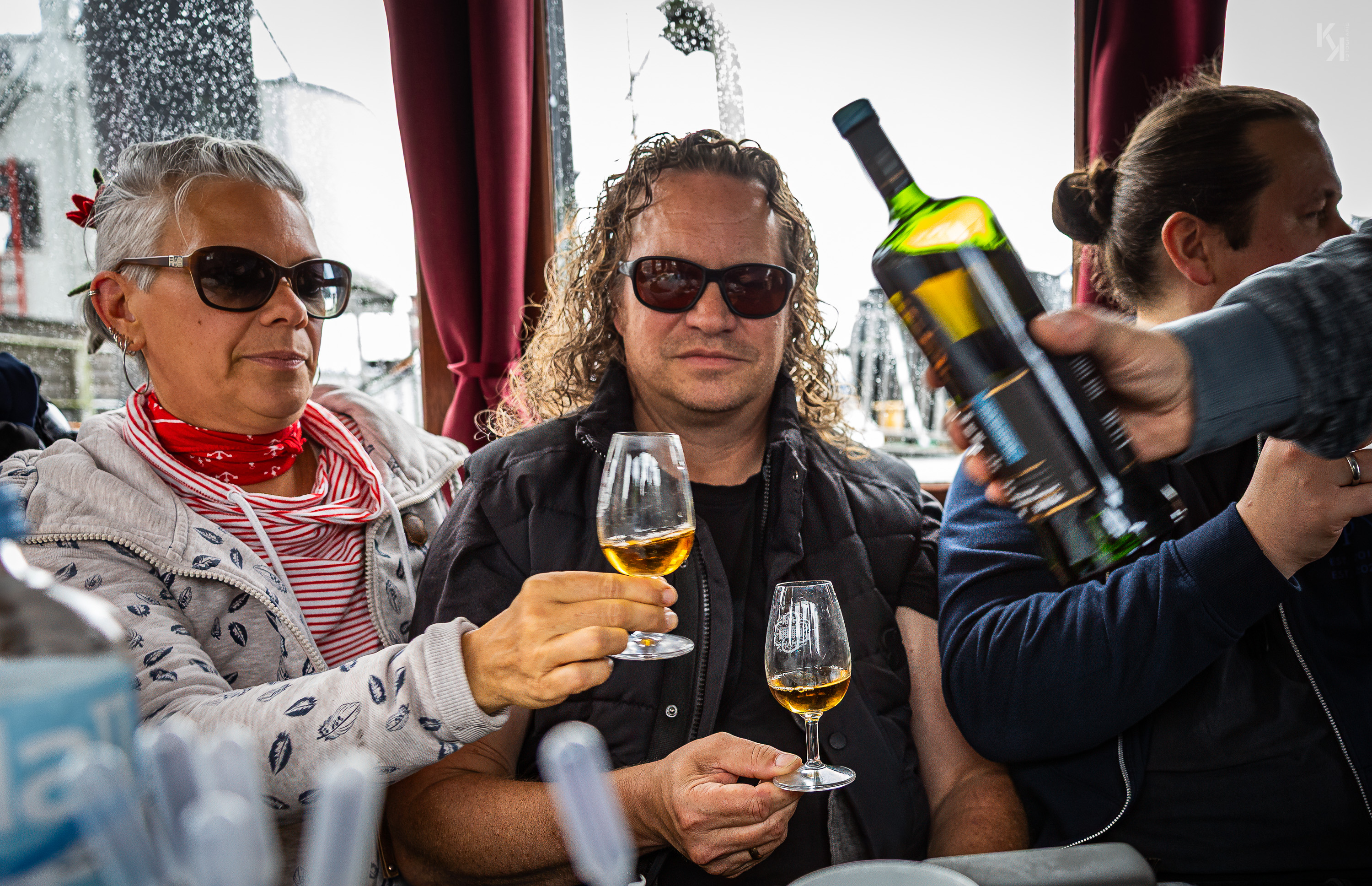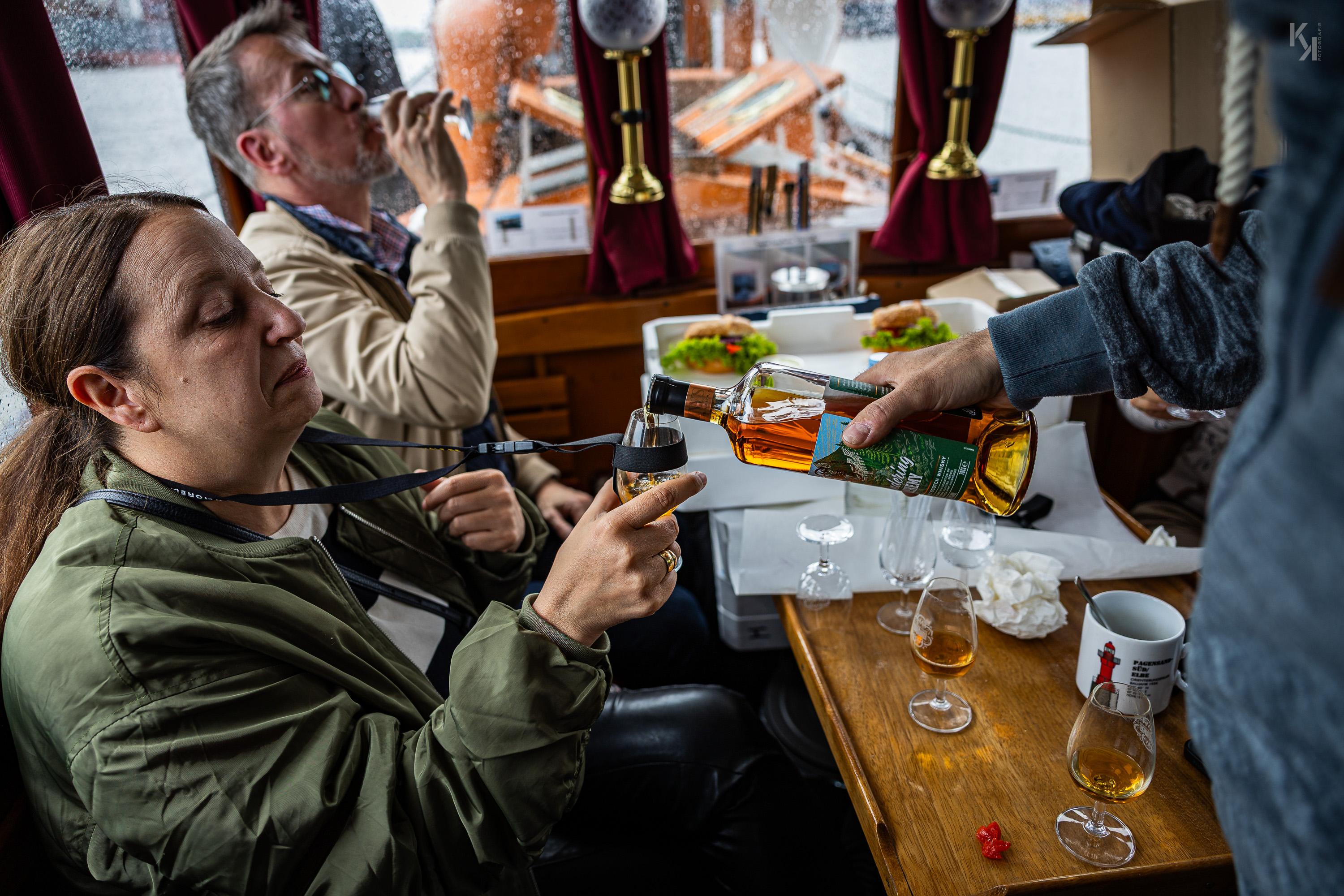 Ich hatte wie immer eigentlich die Tour Nr. 2 gebucht, die am späteren Nachmittag um 16:30 Uhr startete. An diesem zweiten Termin trifft man immer die meisten Whiskyfreunde und -bekannten. Allerdings habe ich die Entscheidung zur zweiten Fahrt recht schnell bereut. War bei der ersten Tour das Wetter noch stabil mit einem Sonne-Wolken-Mix, fing es pünktlich zum Start der zweiten Tour an zu nieseln und später dann zu regnen, so dass sich alle Teilnehmer in die überdachten Bereiche des kleinen Bootes zurückzogen. Dementsprechend wurde es dann auch ganz schön kuschelig, was uns aber im Großen und Ganzen nicht weiter beeindruckte, schließlich gab es jede Menge feinen SMWS-Whisky, der verkostet werden wollte.