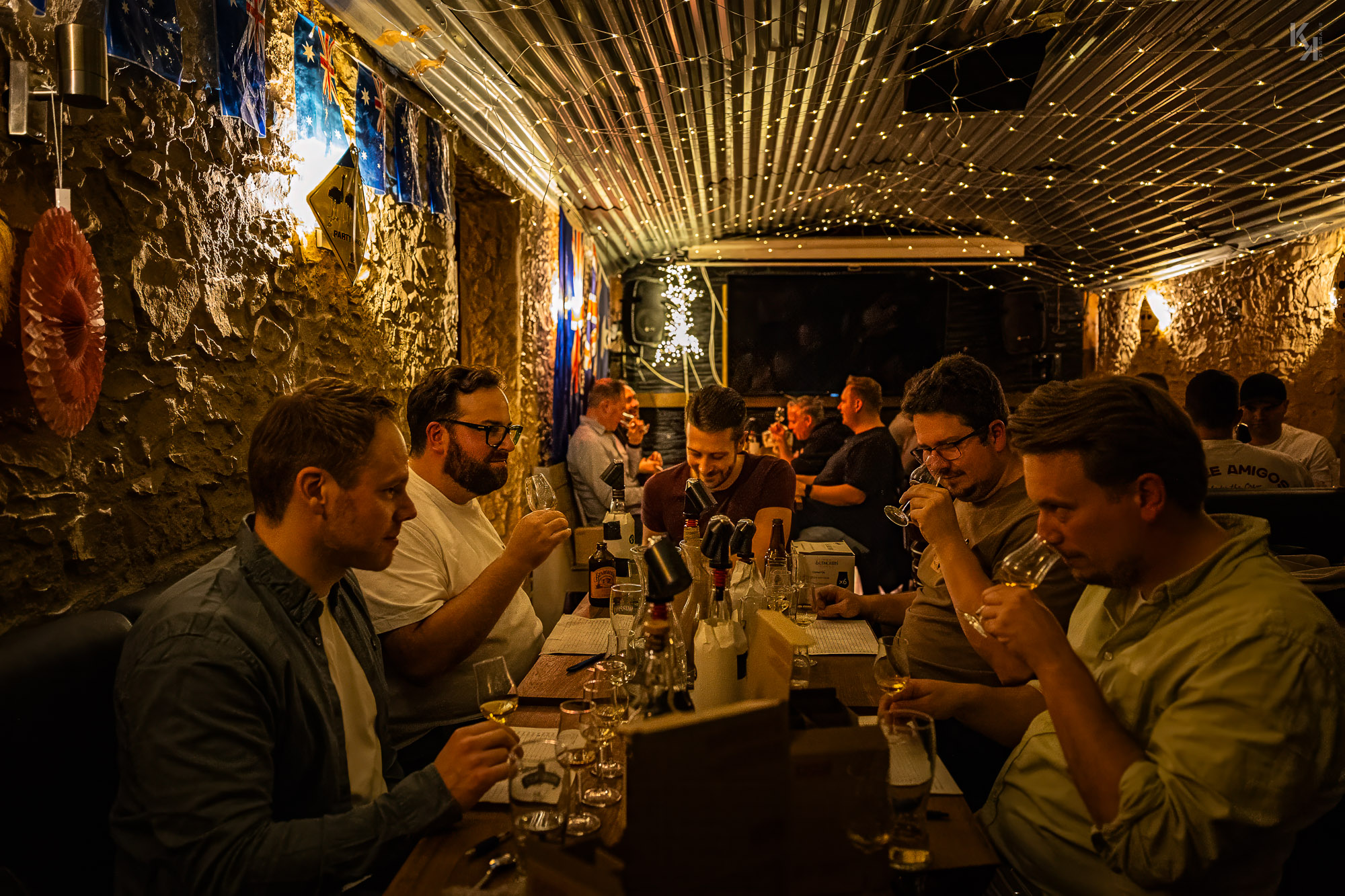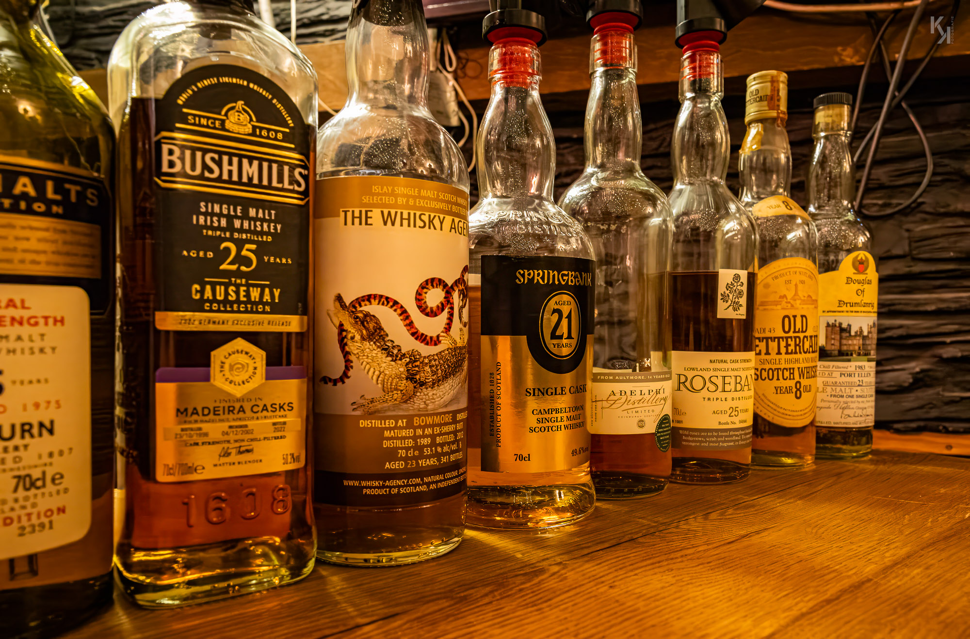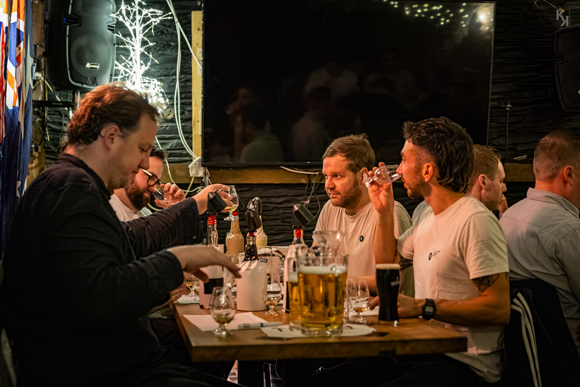 Am Vorabend der Whisky Live im Congress-Centrum-Hamburg fand wieder ein Bring your own bottle-Abend statt, wieder organisiert und moderiert von Sebastian Koch. Zusammengefunden haben wir uns dieses Mal im Down Under, einem australischen Pub in der Grindelallee, quasi bei mir um die Ecke. Basti hatte in dem Pub für uns einen kleinen abgeteilten Raum reserviert und es kamen wieder whiskybesessene Leute aus ganz Deutschland. Was nicht weiter verwunderlich war, fand doch an den nächsten 2 Tagen die Whisky Live von Kirsch Import im CCH statt. Somit mutierte der Abend quasi zum Aufwärmen für das lange Wochenende im CCH, was ihm am Ende des Abends auch ganz hervorragend gelungen ist. Das Konzept des Abends ist mit dem des vorhergehenden Events in Itzehoe bei Flickenschild identisch (hier der Link zum Bericht). Ich will auch gar nicht lang über die Flaschen schreiben, welche wir verkosten konnten, die Fotos sprechen für sich, denke ich. Für mich waren unterm Strich wieder alte Standards die Highlights des Abends, namentlich ein 12-jähriger Bowmore mit 43% vol und ein 8 Jahre alter Fettercairn mit ebenfalls 43% vol. Beide müssen irgendwann in den 70er Jahren des letzten Jahrhunderts abgefüllt worden sein und haben mich schlicht und ergreifend umgehauen. Schade, dass heutzutage solche Flaschen nur noch zu astronomischen Preisen auf dem Sekundarmarkt zu bekommen sind. Man kann sagen, was man will, aber es sind Welten, die die damaligen Standard Single Malts von den heutigen Standards unterscheidet.