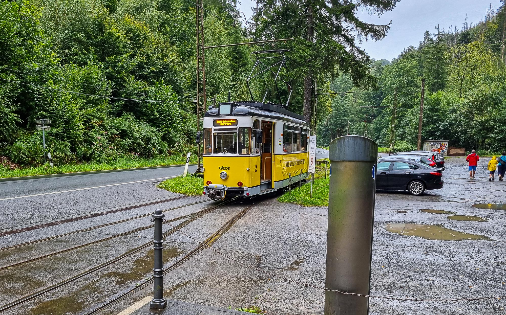 Die gesamte Streckenführung ist eingleisig und die Gleise befinden sich, abgesehen von den Haltestellen, auf der Staatsstraße 165, also direkt auf der Fahrbahn an der rechten Seite, was zur Folge hat, dass, wenn die Tram Richtung Bad Schandau fährt, Fahrzeuge der Bahn direkt entgegen kommen und entsprechend ausweichen und gleichzeitig auf den Gegenverkehr achten müssen. Ich finde das recht problematisch, aber es scheint wohl zu funktionieren. Auf der Rückfahrt fand dann eine erneute Ticketkontrolle durch einen anderen Kontrolleur statt, aber da dort am Lichtenhainer Wasserfall kein Netzempfang bestand, konnte ich denn auch nicht mein D-Ticket vorzeigen. Der Schaffner kannte das Problem und winkte nur leicht genervt ab. Tja, Netzempfang in D halt ...