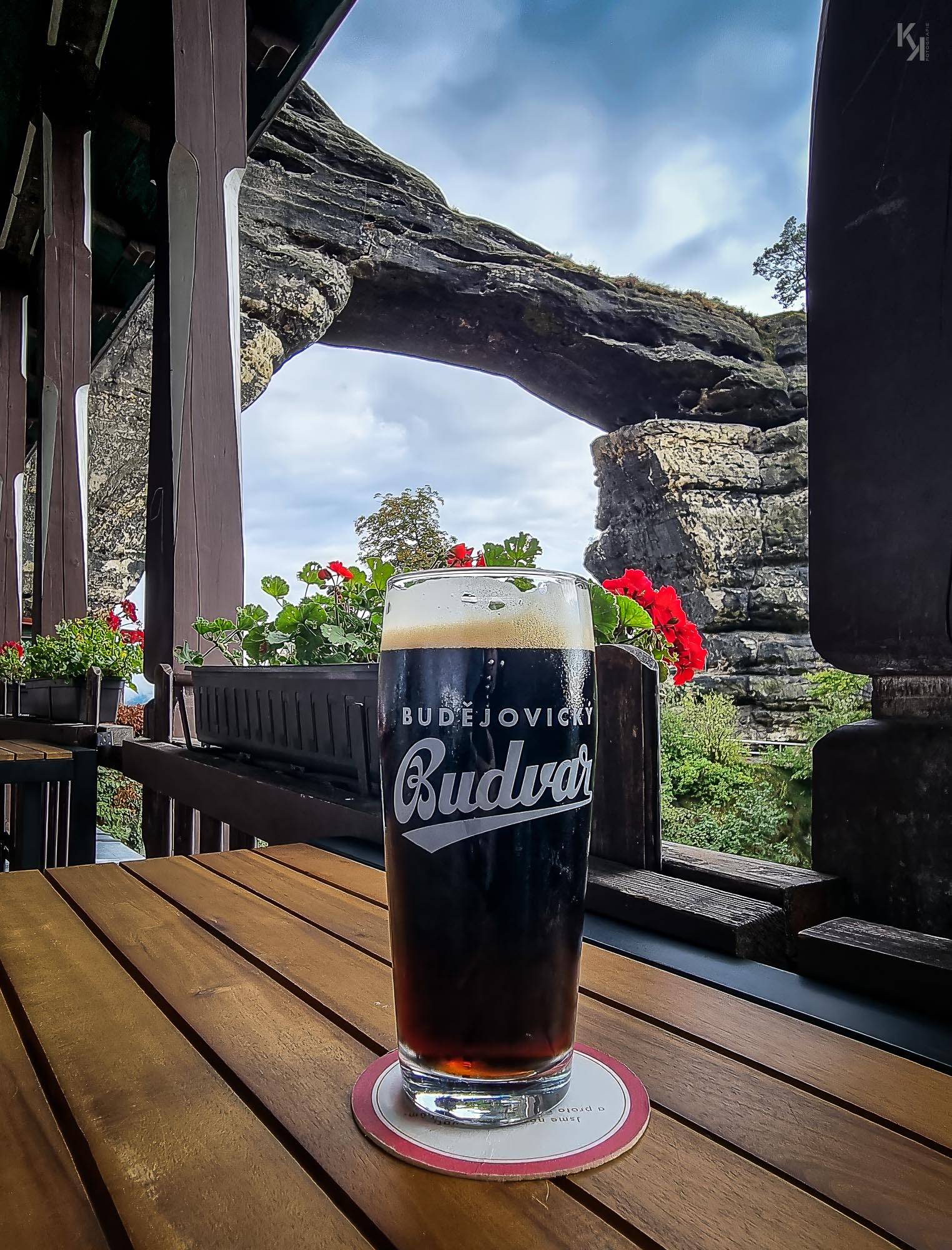 Laut Komoot sollte der Weg nicht sonderlich kompliziert und auch zeitlich durchaus machbar sein, was sich letztlich auch als realistisch erwies. Nur hatte ich, wie schon am Vortage, wieder die Steigung unterschätzt, so dass ich an besagtem Tor vollkommen durchgeschwitzt ankam. Aber das Schwitzen hatte sich als durchaus lohnend erwiesen. Das Prebischtor an sich ist eine wunderschöne Felsformation, die man gesehen haben sollte. Allerdings sei nicht verschwiegen, dass man, wenn man zum Tor und zum gastronomischen Bereich wollte, an einem kleinen Pförtnerhäuschen bei einem alten Mütterlein einen kleinen Obolus entrichten musste, was ich aber in diesem Falle gerne tat. Es gab in dem Bereich dort oben jede Menge zu sehen und entdecken. Treppen, kleine Stege, enge Pfade führten zu immer anderen Aussichten auf die Böhmische Schweiz und auch auf das Pravčická brána. Sehr spannend das Ganze. Die Krönung war dann nach dem ganzen Mühsal ein großes tschechisches schwarzes Budweiser auf dem Freisitz der kleinen Gastwirtschaft. Einfach köstlich, dazu noch der Blick von meinem Platz auf das Tor. Und auch das Wetter veränderte sich zum Positiven, der Himmel klarte langsam auf und die Sonnen schien ab und an und tauchte das Gebiet in wundervollstes Fotografenlicht. Was will man mehr.